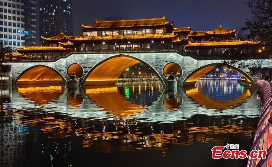 Night view of Anshun bridge, a famous historic bridge and landmark along the Jinjiang River in Chengdu, a travel hub in southwest China's Sichuan Province, Sept. 28, 2022. (Photo: China News Service/Lv Yang)