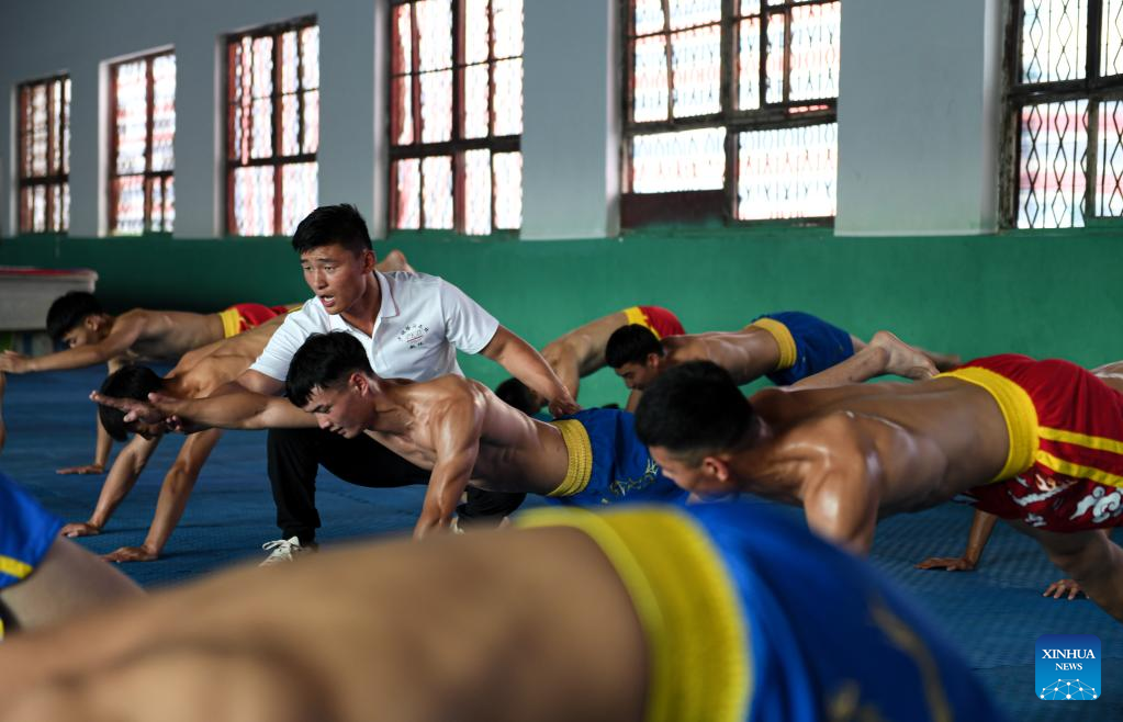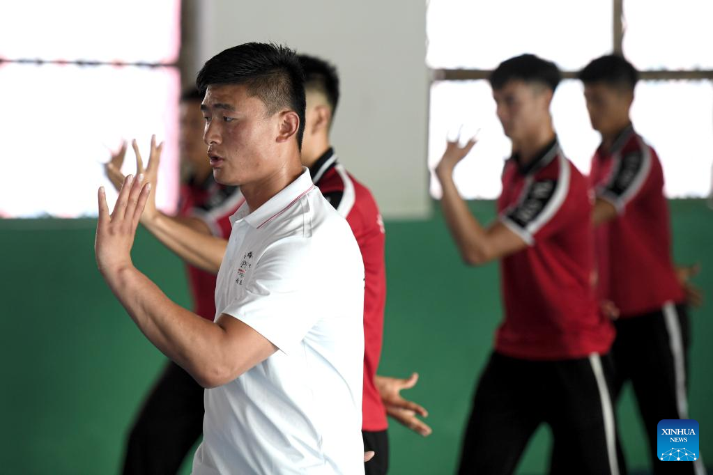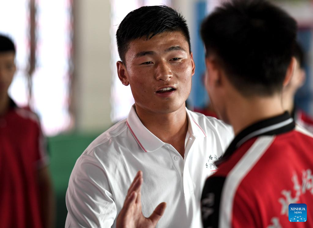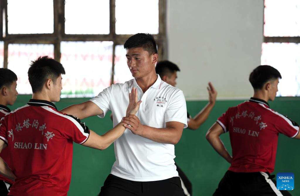 Li Yinggang (C) instructs students during a martial arts class at Shaolin Tagou Martial Arts School in Songshan, central China's Henan province, July 6, 2022. 25-year-old Li Yinggang is a coach at Shaolin Tagou Martial Arts School in Songshan, central China's Henan province. He started martial arts practise at the age of 9 and shifted to free combat 3 years later. Since he was 16 years old, Li has been taking part in the professional free combat competitions, ever winning the titles of domestic and international events several times including two golden belts of Chinese National Free Combat League. As Li Yinggang said, practicing traditional martial arts helps a lot for improving his free combat skills. Nowdays, Li aims to impart his understandings and experience of traditional martial arts to students during his classes, hoping they can master the essence of martial arts, and inherit and develop Chinese martial arts. (Xinhua/Wu Gang)
