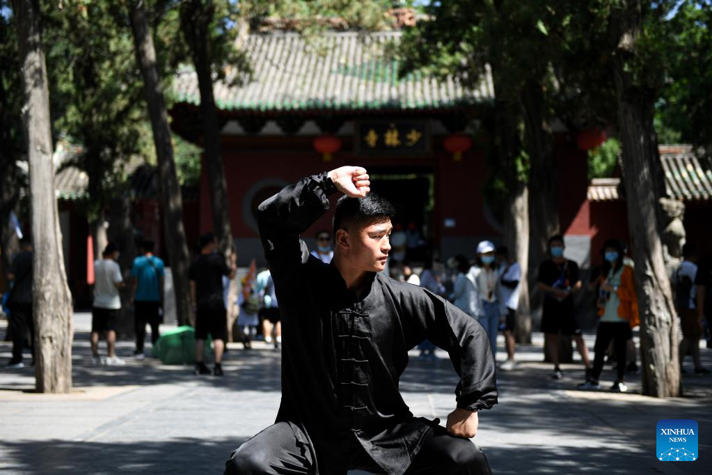 Li Yinggang practices martial arts at Shaolin Temple in Songshan, central China's Henan province, July 7, 2022. 25-year-old Li Yinggang is a coach at Shaolin Tagou Martial Arts School in Songshan, central China's Henan province. He started martial arts practise at the age of 9 and shifted to free combat 3 years later. Since he was 16 years old, Li has been taking part in the professional free combat competitions, ever winning the titles of domestic and international events several times including two golden belts of Chinese National Free Combat League. As Li Yinggang said, practicing traditional martial arts helps a lot for improving his free combat skills. Nowdays, Li aims to impart his understandings and experience of traditional martial arts to students during his classes, hoping they can master the essence of martial arts, and inherit and develop Chinese martial arts. (Xinhua/Liu Jinhui)