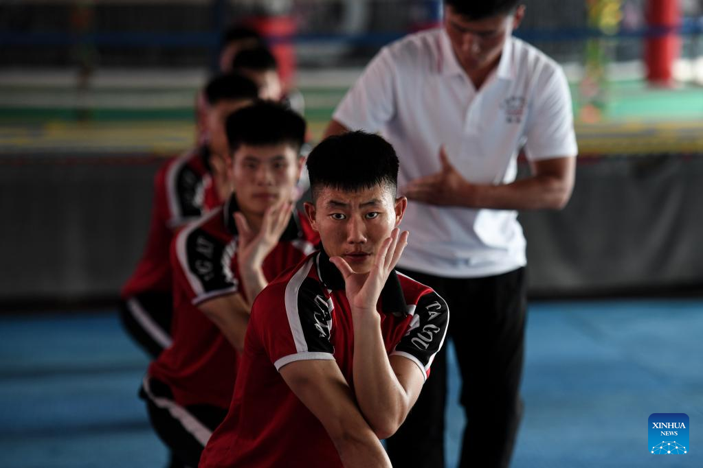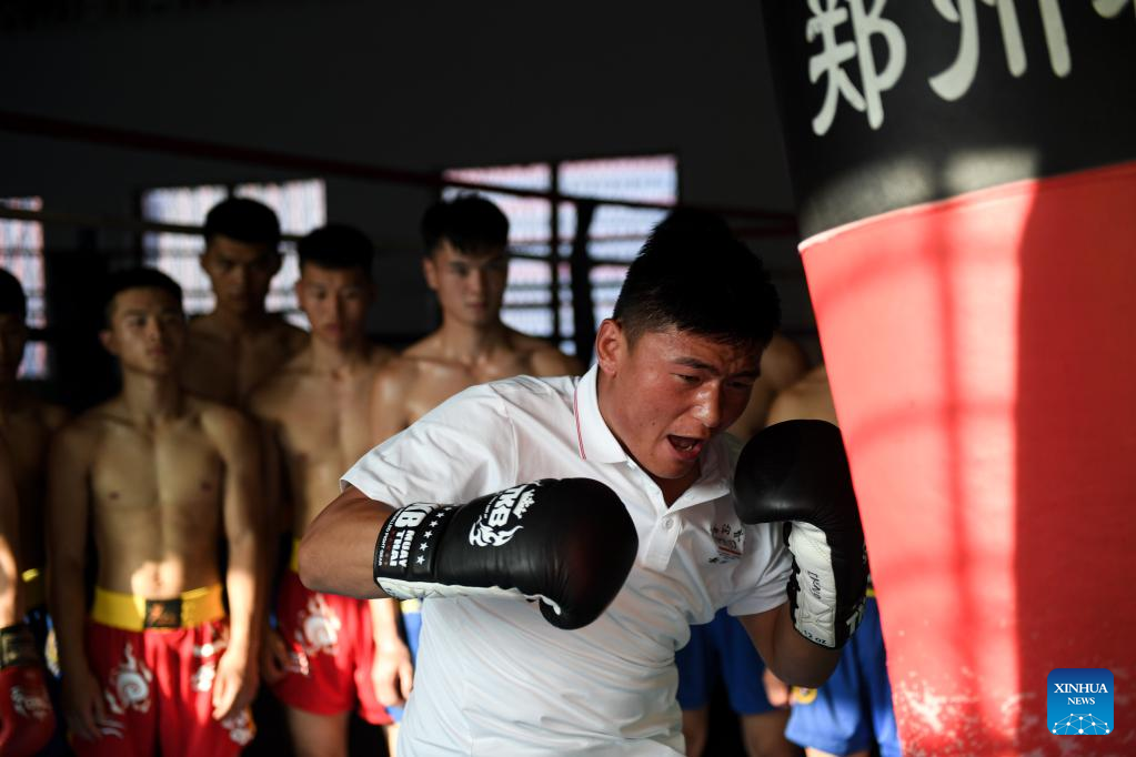 Li Yinggang demonstrates for students during a free combat class at Shaolin Tagou Martial Arts School in Songshan, central China's Henan province, July 6, 2022. 25-year-old Li Yinggang is a coach at Shaolin Tagou Martial Arts School in Songshan, central China's Henan province. He started martial arts practise at the age of 9 and shifted to free combat 3 years later. Since he was 16 years old, Li has been taking part in the professional free combat competitions, ever winning the titles of domestic and international events several times including two golden belts of Chinese National Free Combat League. As Li Yinggang said, practicing traditional martial arts helps a lot for improving his free combat skills. Nowdays, Li aims to impart his understandings and experience of traditional martial arts to students during his classes, hoping they can master the essence of martial arts, and inherit and develop Chinese martial arts. (Xinhua/Liu Jinhui)