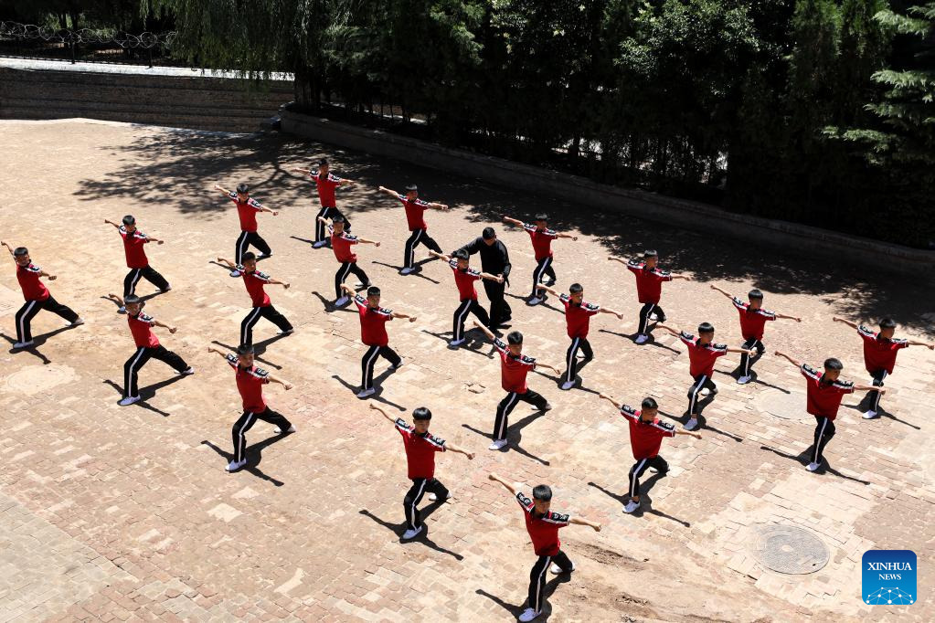 Students practice during a martial arts class under the instructions of coach Li Yinggang at Shaolin Tagou Martial Arts School in Songshan, central China's Henan province, July 6, 2022. 25-year-old Li Yinggang is a coach at Shaolin Tagou Martial Arts School in Songshan, central China's Henan province. He started martial arts practise at the age of 9 and shifted to free combat 3 years later. Since he was 16 years old, Li has been taking part in the professional free combat competitions, ever winning the titles of domestic and international events several times including two golden belts of Chinese National Free Combat League. As Li Yinggang said, practicing traditional martial arts helps a lot for improving his free combat skills. Nowdays, Li aims to impart his understandings and experience of traditional martial arts to students during his classes, hoping they can master the essence of martial arts, and inherit and develop Chinese martial arts. (Xinhua/Wu Gang)