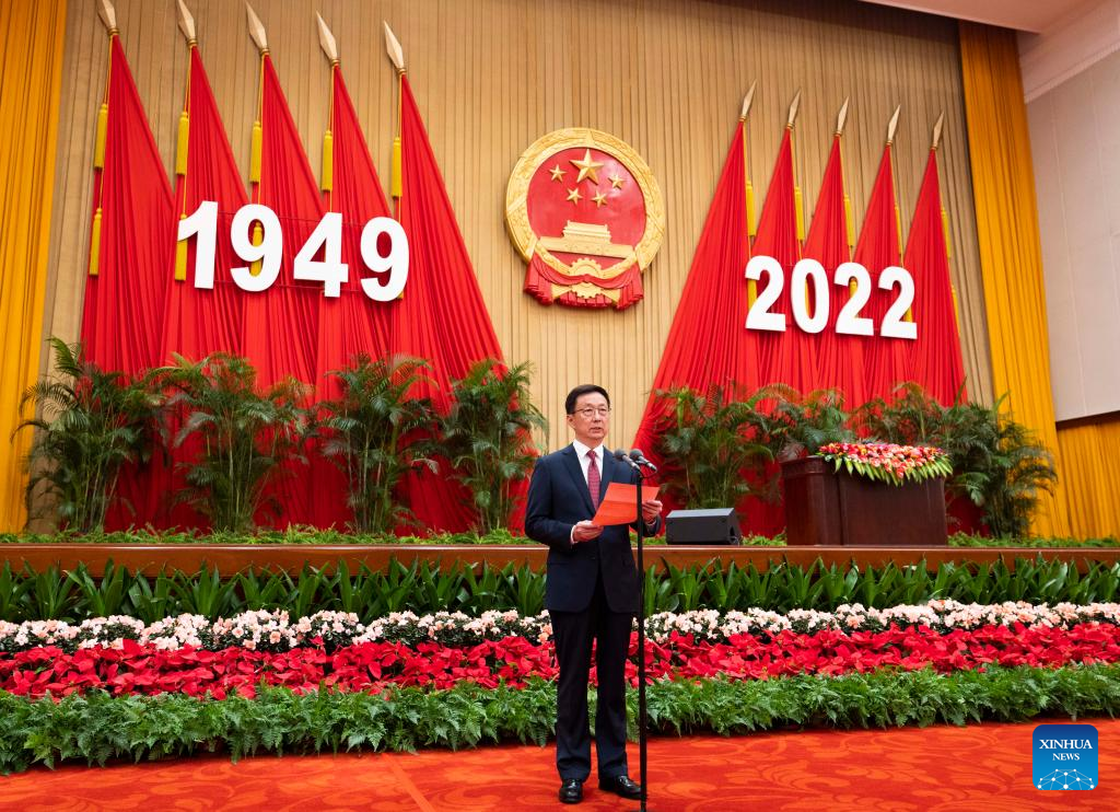 Chinese Vice Premier Han Zheng, also a member of the Standing Committee of the Political Bureau of the Communist Party of China Central Committee, presides over a reception held by the State Council to celebrate the 73rd anniversary of the founding of the People's Republic of China at the Great Hall of the People in Beijing, capital of China, Sept. 30, 2022. (Xinhua/Huang Jingwen)