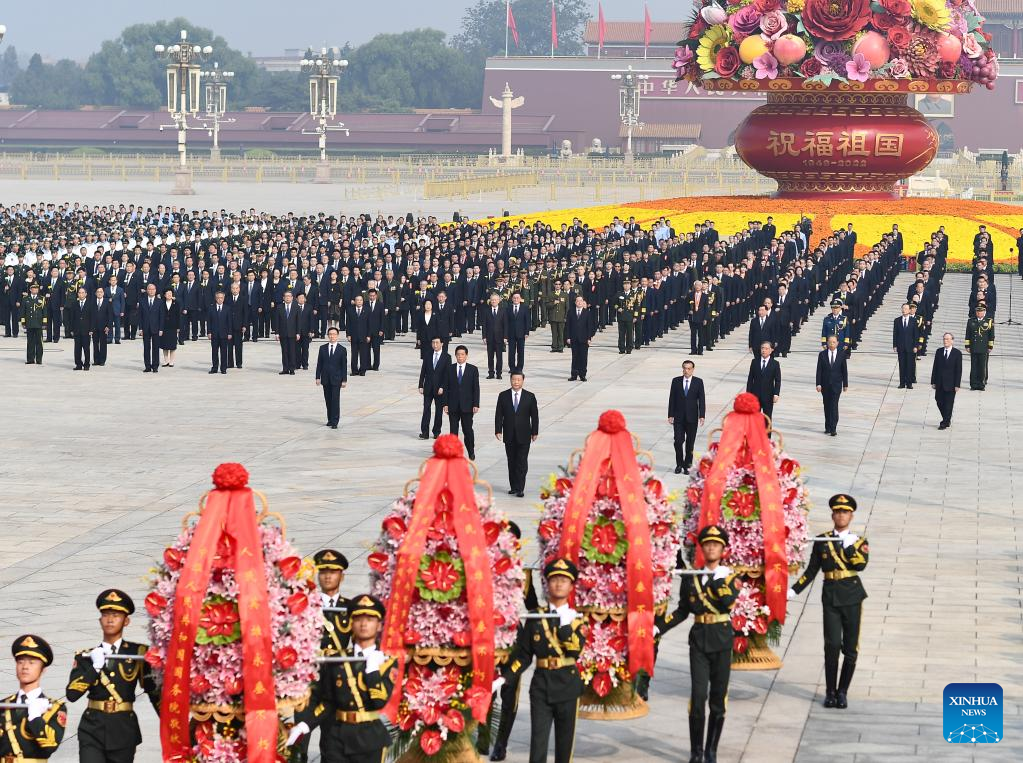 BEIJING, Sept. 30 (Xinhua) -- Xi Jinping and other leaders of the Communist Party of China and the state attended a ceremony on Friday morning in Tian'anmen Square in Beijing to present flower baskets to fallen national heroes.