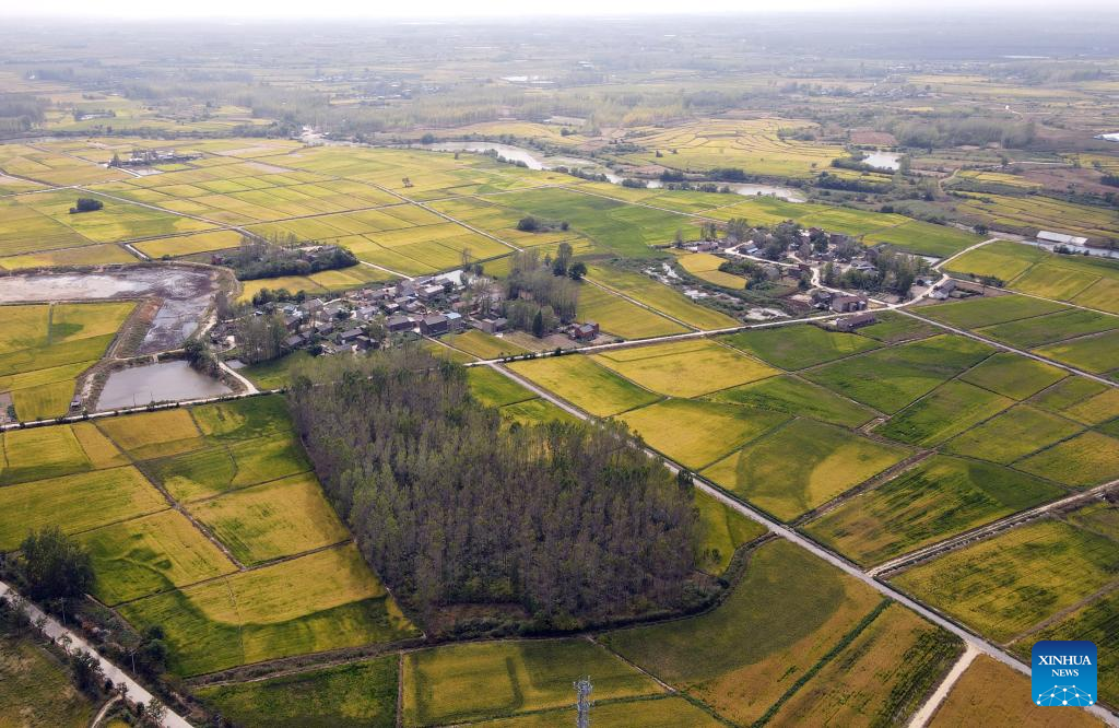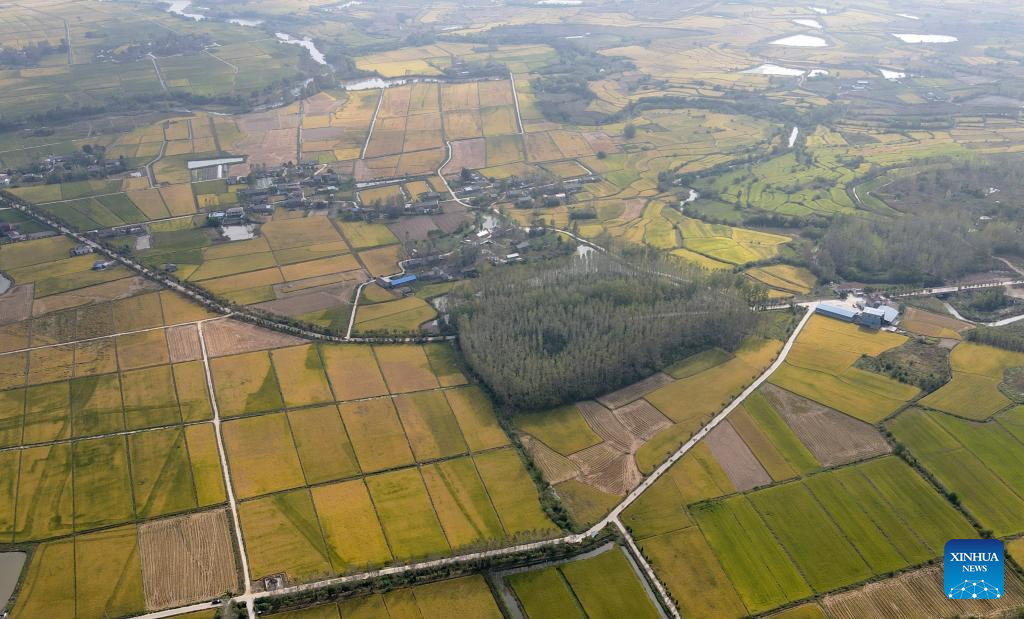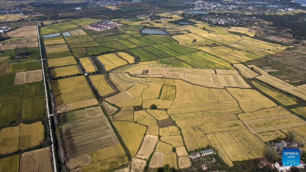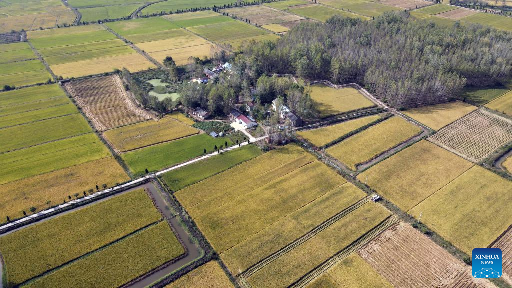 Aerial photo taken on Sept. 29, 2022 shows paddy fields in Gucheng Town of Hefei, east China's Anhui Province. (Xinhua/Zhou Mu)