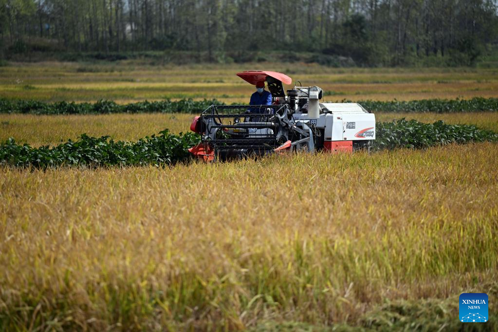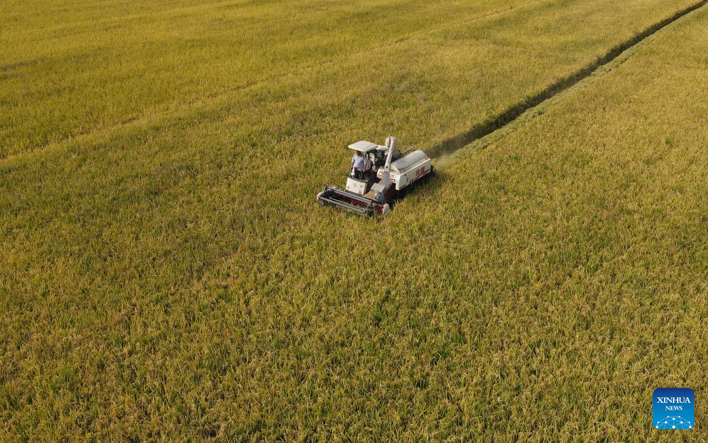 A farmer driving a reaper harvests paddy in a field in Gucheng Town of Hefei, east China's Anhui Province, Sept. 29, 2022. (Xinhua/Zhou Mu)