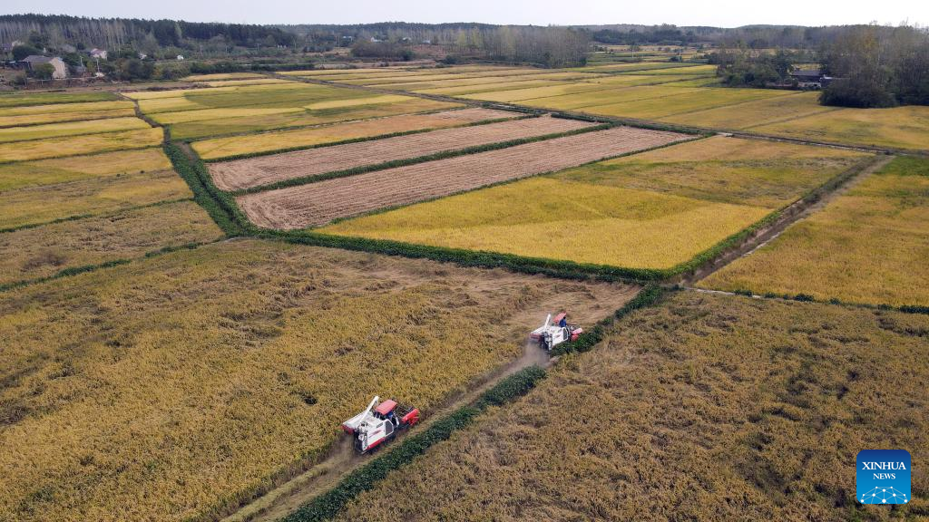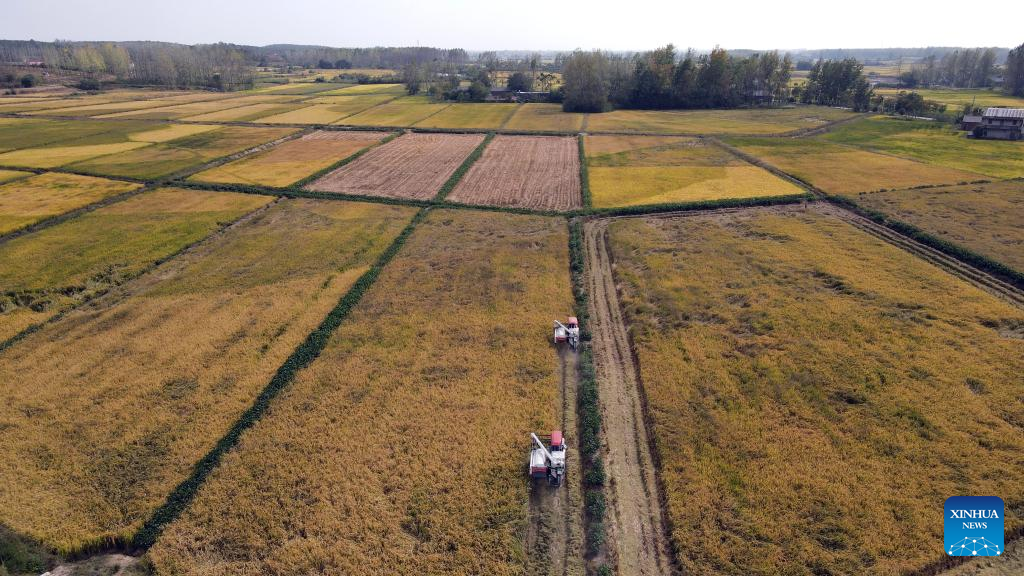 Aerial photo taken on Sept. 29, 2022 shows farmers driving reapers harvesting paddy in a field in Gucheng Town of Hefei, east China's Anhui Province. (Xinhua/Zhou Mu)