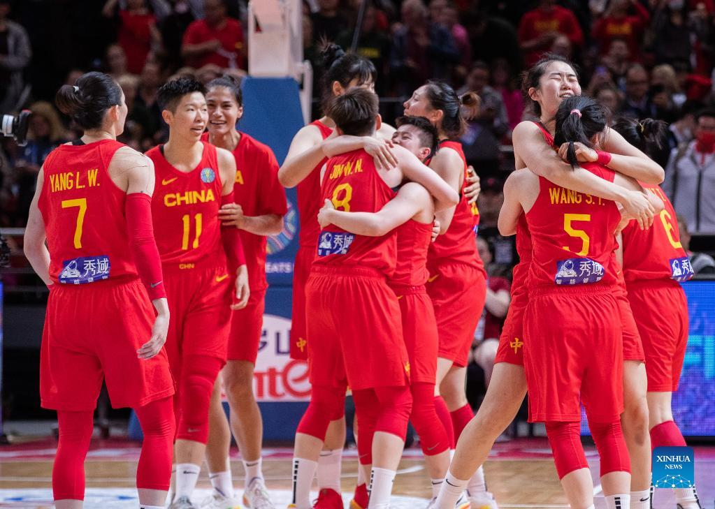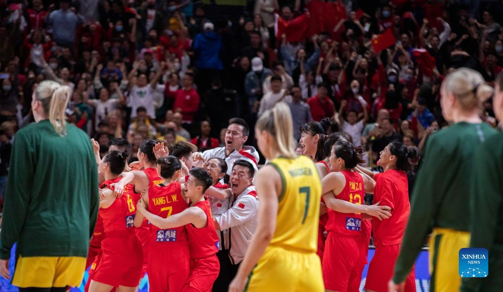 Players of China celebrate after winning the semifinal match against Australia at Women's basketball World cup 2022 in Sydney, Australia, Sept. 30, 2022. (Photo by Hu Jingchen/Xinhua)