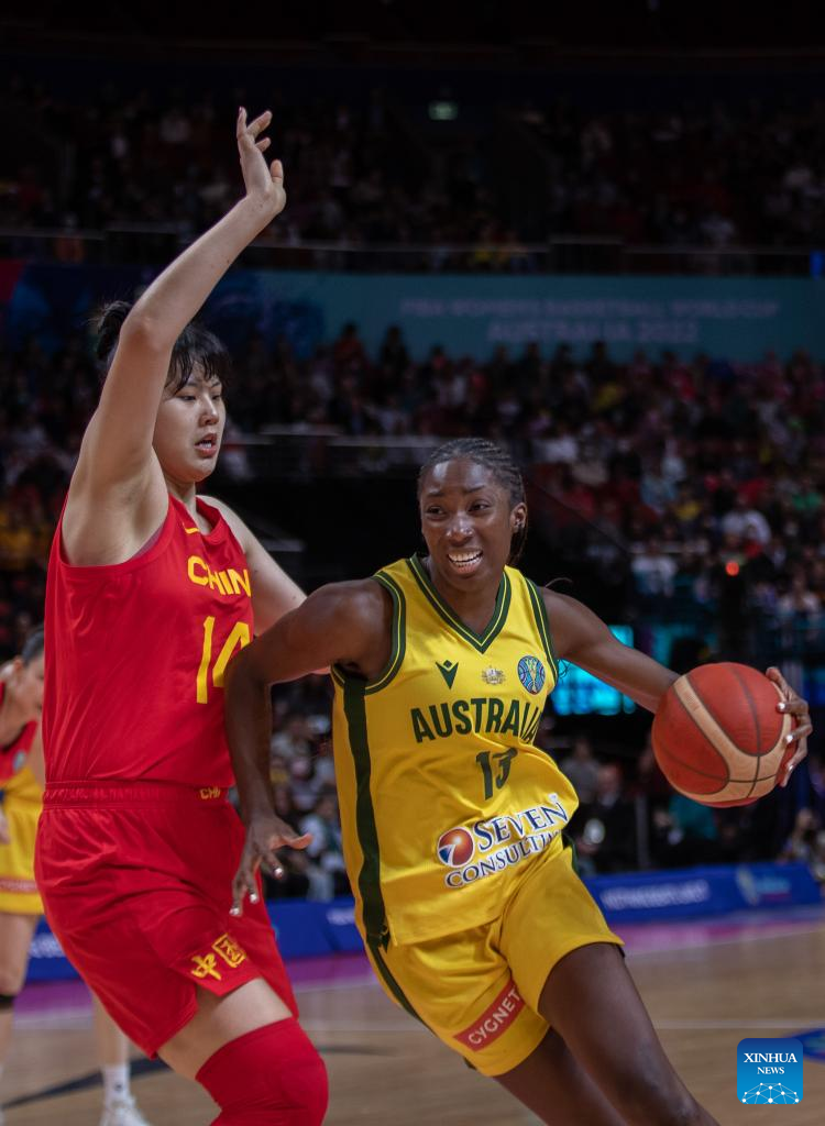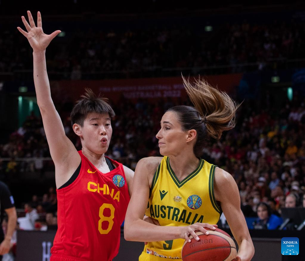 Bec Allen (R) of Australia controls the ball under the defense of Jin Weina of China during the semifinal match at Women's Basketball World Cup 2022 in Sydney, Australia, Sept. 30, 2022. (Photo by Hu Jingchen/Xinhua)