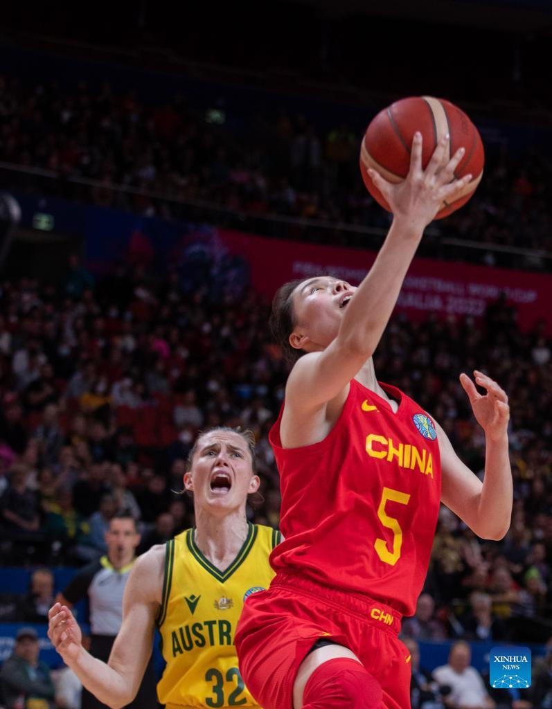 Wang Siyu (R) of China goes for a lay-up during the semifinal match against Australia at Women's basketball World cup 2022 in Sydney, Australia, Sept. 30, 2022. (Photo by Hu Jingchen/Xinhua)
