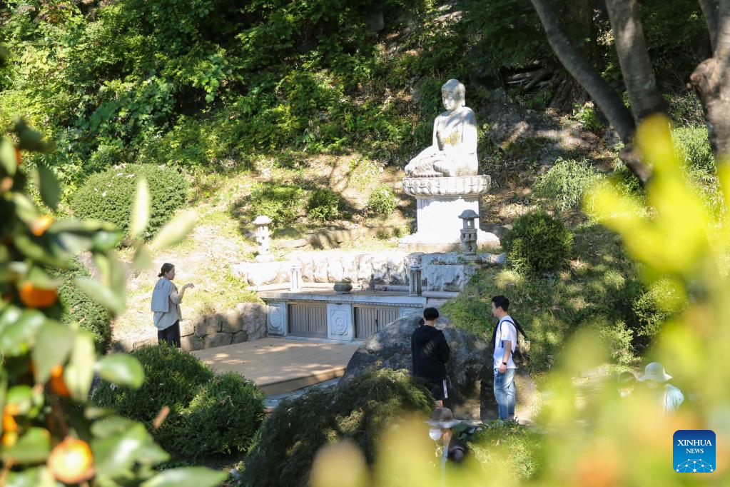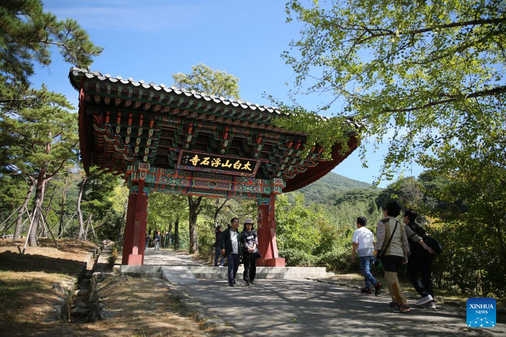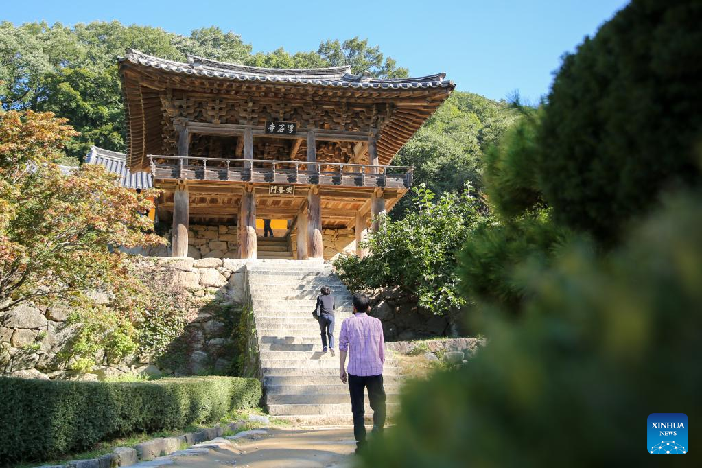 Tourists visit the Buseoksa Temple in Yeongju, South Korea, Oct. 1, 2022. Buseoksa Temple is one of the seven Buddhist mountain monasteries in South Korea which were listed by the UNESCO as world heritage sites in 2018. (Xinhua/Wang Yiliang)