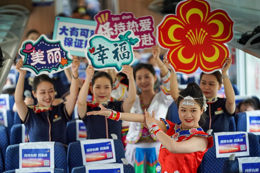 Railway crew perform aboard a bullet train running for trial along the Dali-Baoshan section of the Dali-Ruili Railway in southwest China's Yunnan Province, July 19, 2022. (Xinhua/Jiang Wenyao)