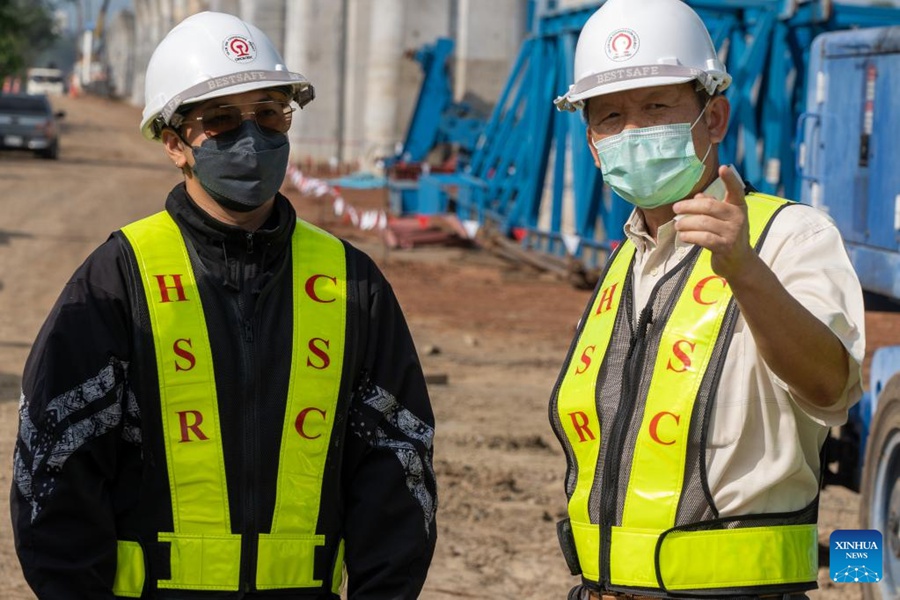 Viroj Lubkritcom (R), a project supervisor of the China Railway Design Corporation (Thailand Branch), works at a construction site of the China-Thailand railway in Nakhon Ratchasima province, Thailand, Sept. 7, 2022. Twenty-four-year-old Nantapong Nuchanet has been expecting to drive a train that runs fast and steady in his home country Thailand. As the construction of the China-Thailand railway continues apace, he feels getting closer to his dream job. (Xinhua/Lin Hao)