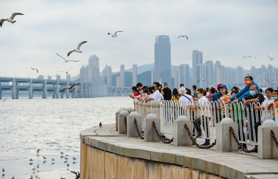 Citizens are seen at the Xinghai Square in Dalian, northeast China's Liaoning Province, Oct. 1, 2022. Saturday marks the first day of China's week-long National Day holiday. (Photo by Zou Jingyi/Xinhua)