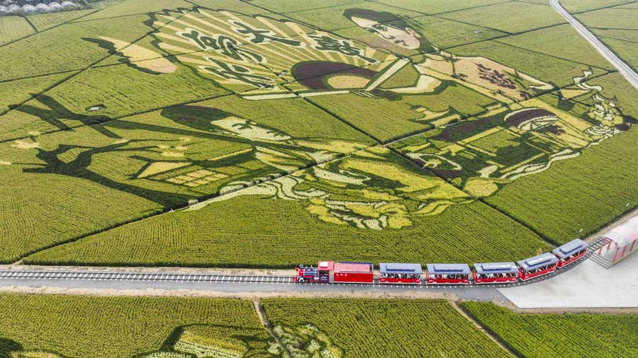 Aerial photo taken on Oct. 1, 2022 shows tourists on a train driving through fields in Shanligezhuang Village of Zunhua, north China's Hebei Province. (Photo by Liu Mancang/Xinhua)
