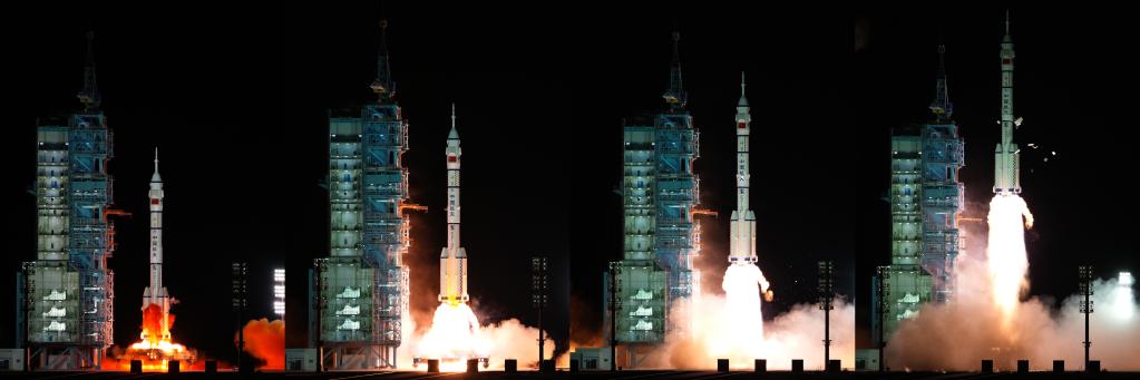 The combo photo shows the crewed spaceship Shenzhou-13, atop a Long March-2F carrier rocket, being launched from the Jiuquan Satellite Launch Center in northwest China's Gobi Desert, Oct. 16, 2021. (Xinhua/Li Gang)
