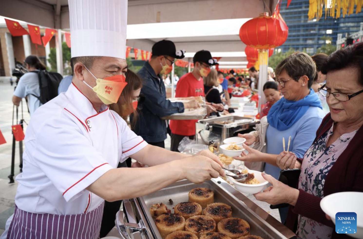 People try Chinese food during the Chinese Culture Week 2022 in Tirana, Albania, Sept. 30, 2022. A series of Chinese cultural activities have been held in Albania's capital city Tirana since Sept. 26, including a Chinese culture-themed gala at the city center Friday evening. (Photo by Gent Onuzi/Xinhua)