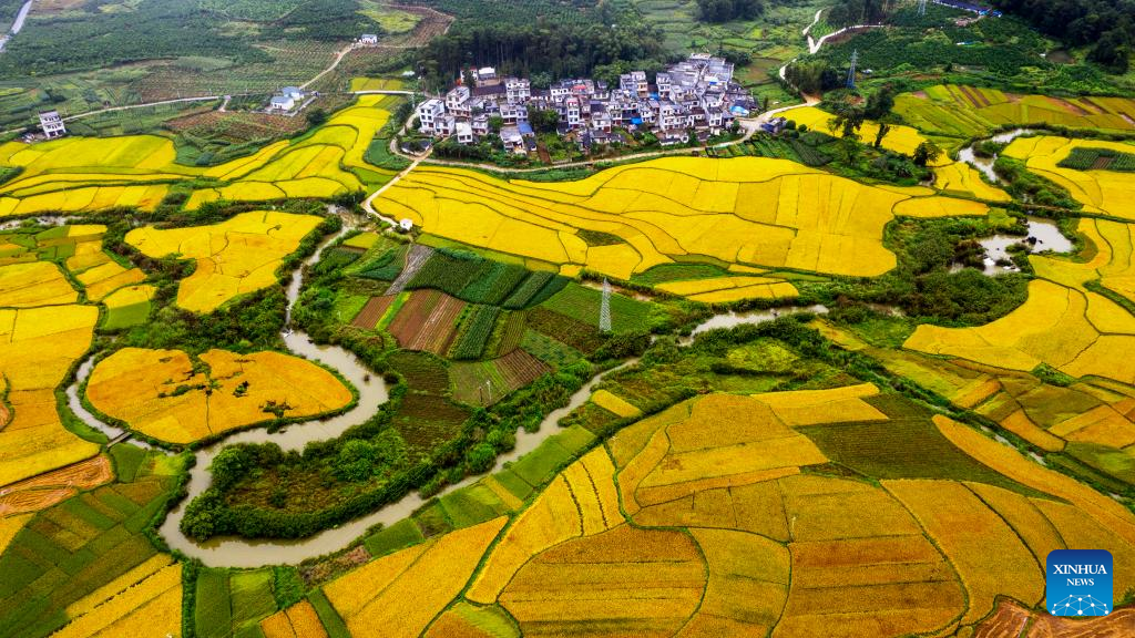 Aerial photo taken on Oct. 2, 2022 shows paddy fields in Jingxi, south China's Guangxi Zhuang Autonomous Region. (Photo by Zhao Jingwu/Xinhua)