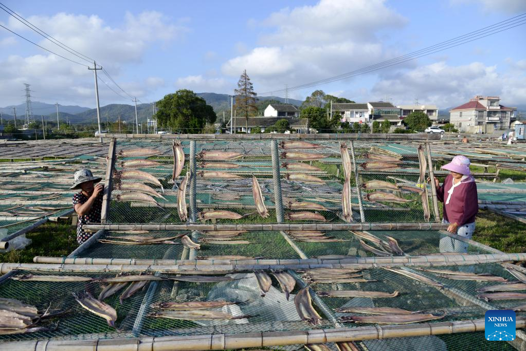 People dries fish in Zhoushan, east China's Zhejiang Province, Oct. 2, 2022. (Photo by Hu Sheyou/Xinhua)