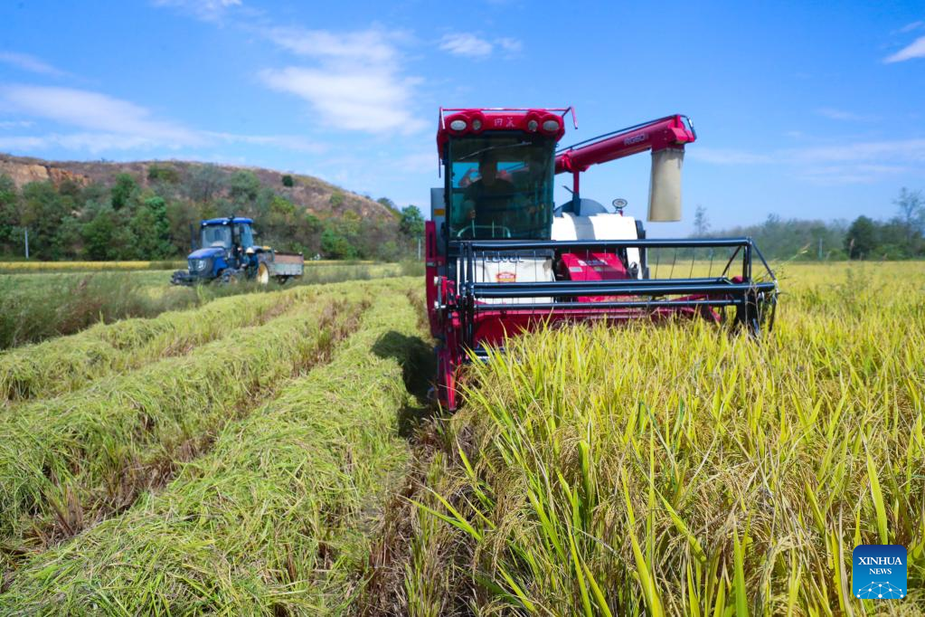 Farmers harvest rice in Guangshan County of Xinyang, central China's Henan Province, Oct. 2, 2022. (Photo by Xie Wanbai/Xinhua)