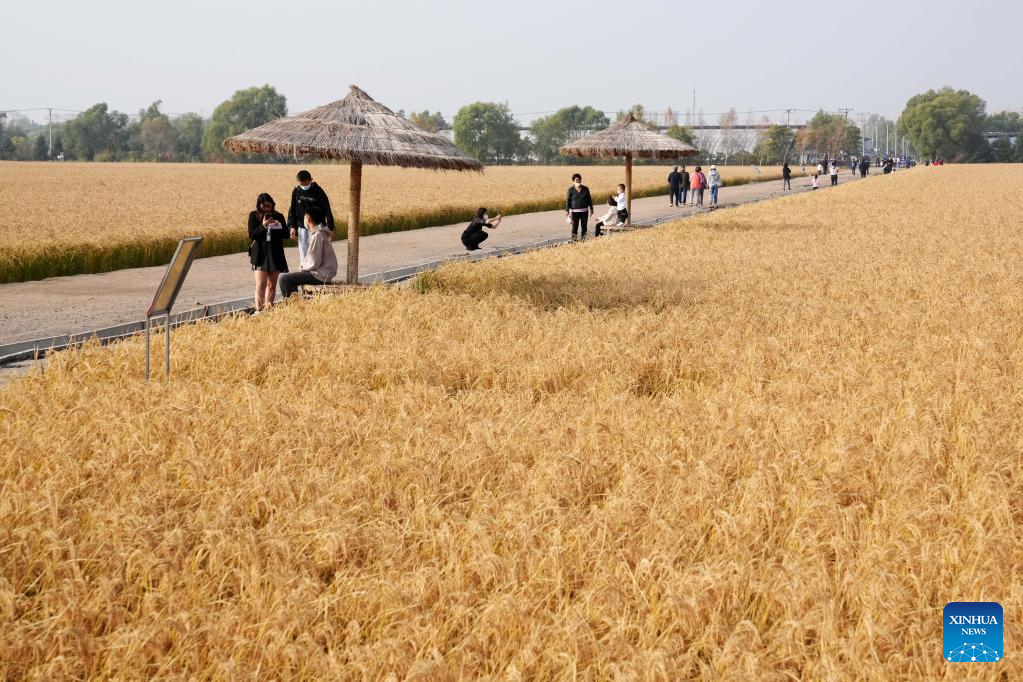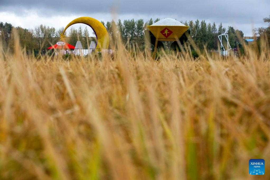 Tourists have fun at a paddy field of Yanjiagang Farm Co., Ltd. of Beidahuang Group in northeast China's Heilongjiang Province, Oct. 2, 2022. (Xinhua/Wang Jianwei)