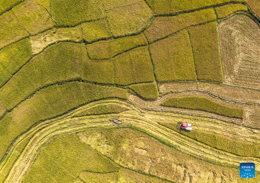 Aerial photo taken on Oct. 1, 2022 shows a harvester in paddy fields in Zigui County of Yichang, central China's Hubei Province. (Photo by Wang Gang/Xinhua)