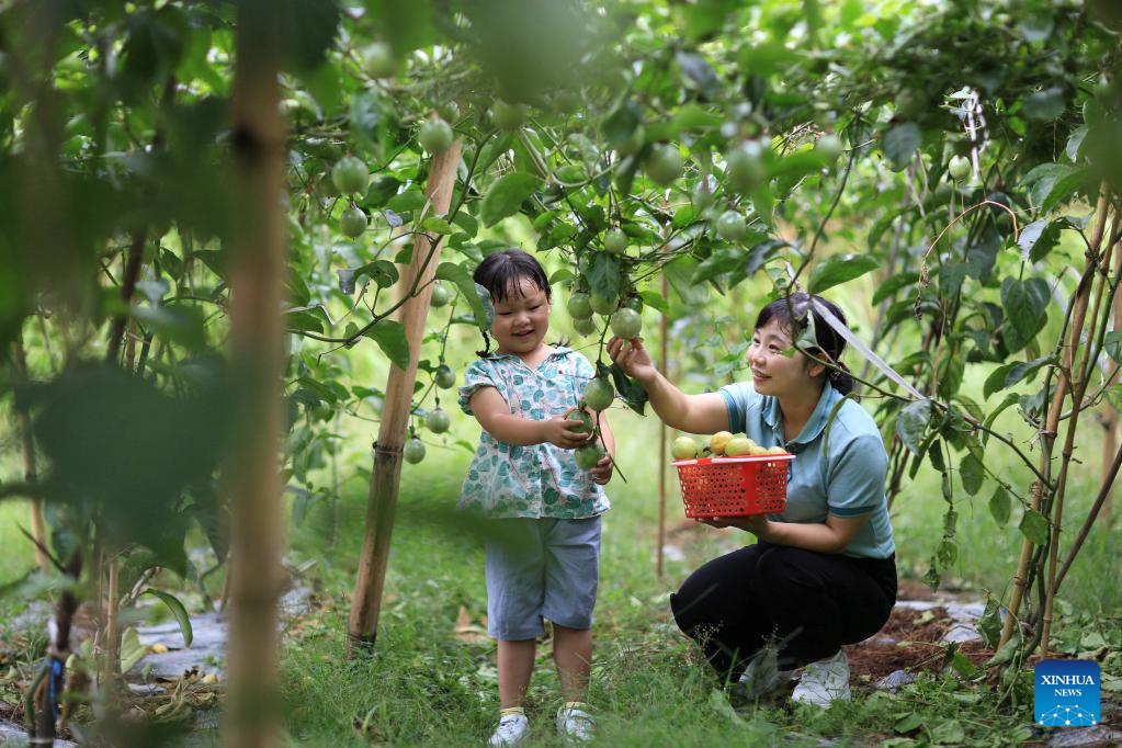 Tourists pick passion fruits at an orchard in Rongjiang County, southwest China's Guizhou Province, Oct. 2, 2022. (Photo by Yang Chengli/Xinhua)