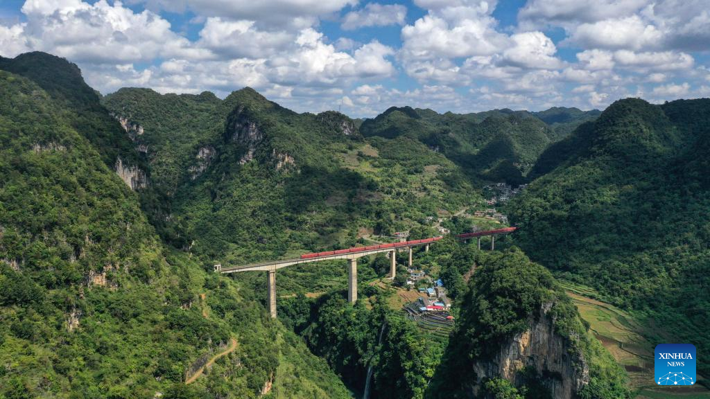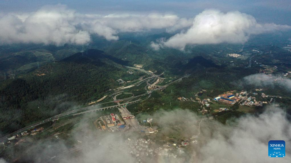 Aerial photo taken on Oct. 4, 2022 shows a section of the Shantou-Kunming expressway in Baise City, south China's Guangxi Zhuang Autonomous Region. (Xinhua/Zhang Ailin)
