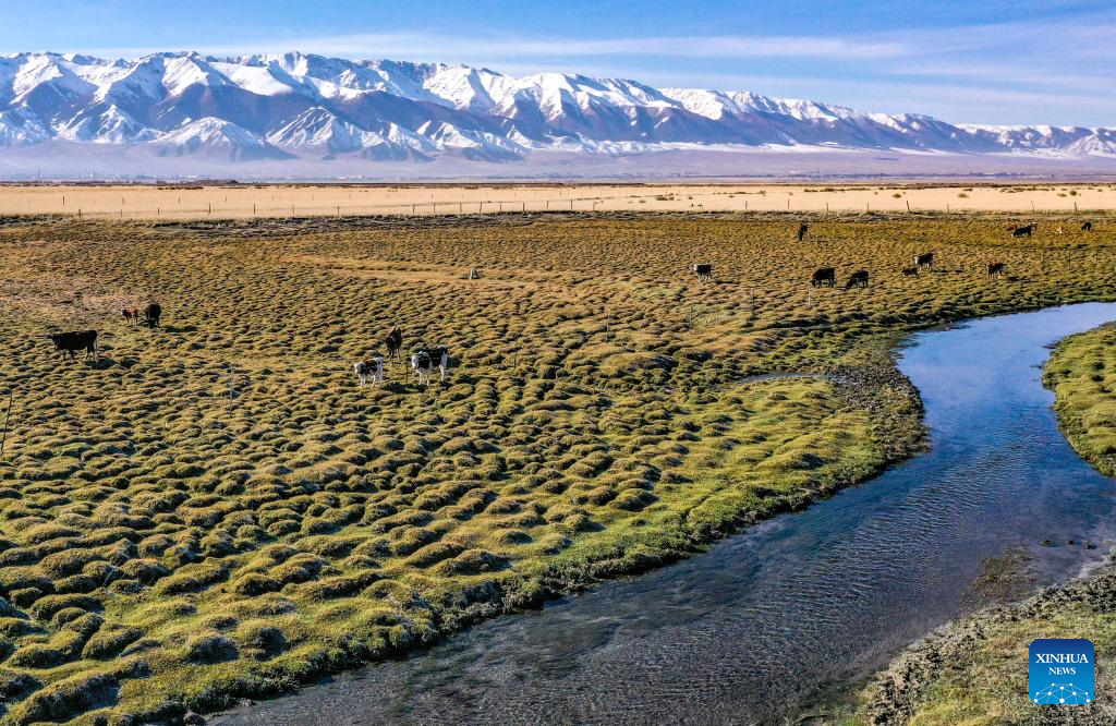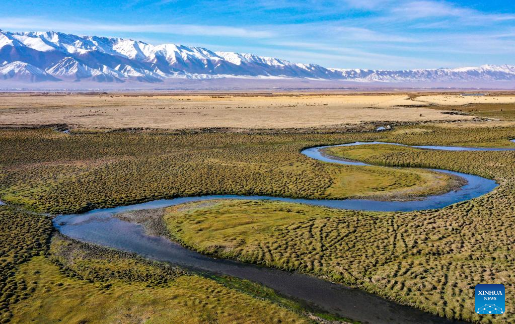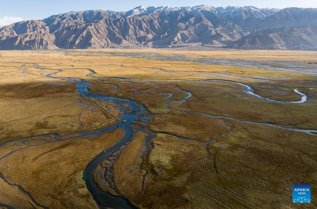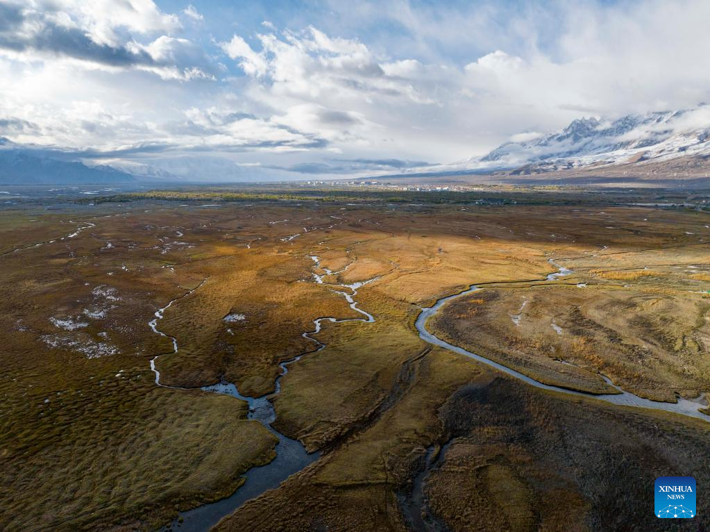 Aerial photo taken on Oct. 4, 2022 shows a wetland park in Taxkorgan Tajik Autonomous County, northwest China's Xinjiang Uygur Autonomous Region. (Photo by Ji Wenzhi/Xinhua)