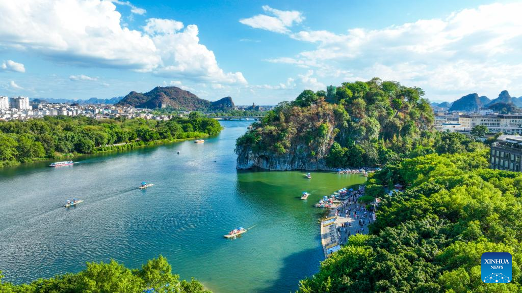 Aerial photo taken on Oct. 3, 2022 shows a view of Xiangbi Mountain on Lijiang River in Guilin City, south China's Guangxi Zhuang Autonomous Region. (Photo by Liu Zheng/Xinhua)