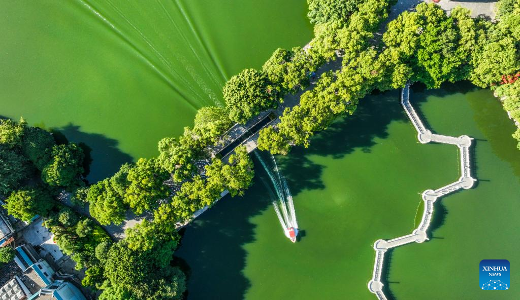 Aerial photo taken on Oct. 3, 2022 shows a boat sailing on a lake in Guilin City, south China's Guangxi Zhuang Autonomous Region. (Photo by Liu Zheng/Xinhua)