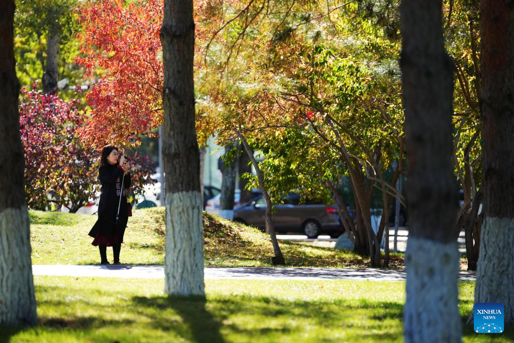 A woman takes photos at Xiangjiang Park in Harbin, northeast China's Heilongjiang Province, Oct. 4, 2022. (Xinhua/Wang Jianwei)