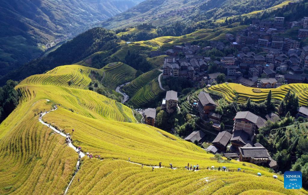 Aerial photo taken on Oct. 3, 2022 shows people visiting the paddy fields in Lianshan Zhuang and Yao Autonomous County, south China's Guangdong Province. (Xinhua/Deng Hua)