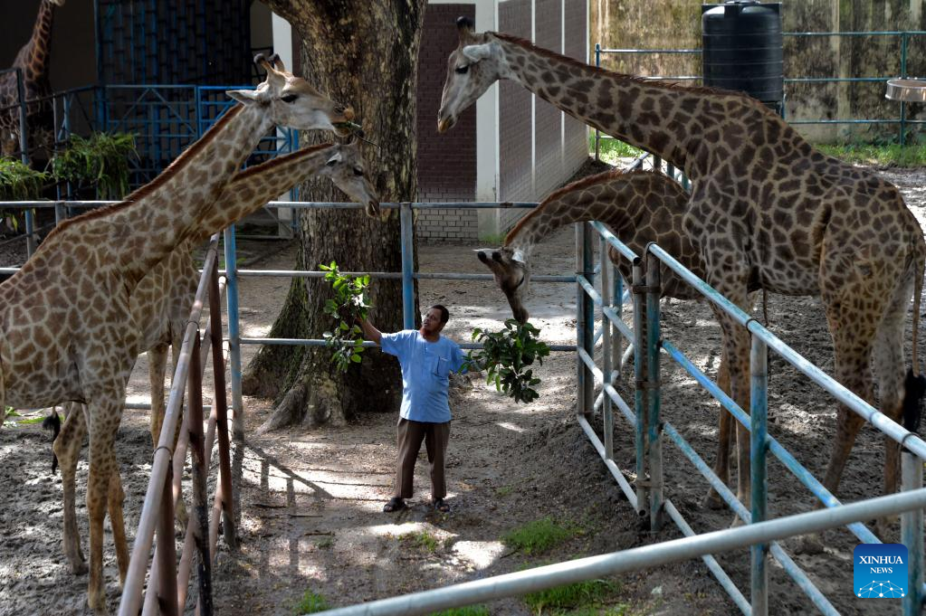 A zookeeper feeds giraffes at the Bangladesh National Zoo in Dhaka, Bangladesh, on Oct. 4, 2022, the World Animal Day. (Xinhua)