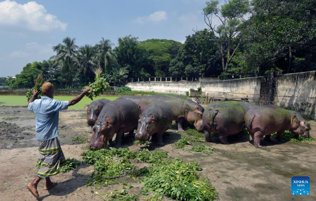 A zookeeper feeds hippopotamuses at the Bangladesh National Zoo in Dhaka, Bangladesh, on Oct. 4, 2022, the World Animal Day. (Xinhua)