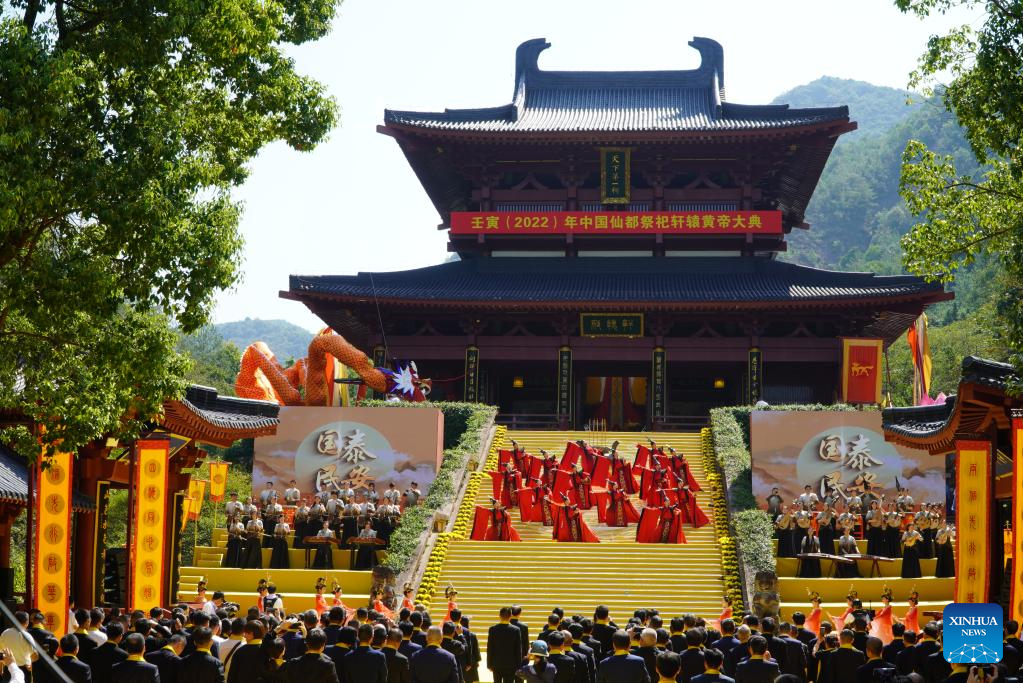 A grand ceremony paying tribute to the Yellow Emperor, considered one of the common ancestors for all Chinese, is held in Jinyun County, east China's Zhejiang Province, Oct. 4, 2022. (Xinhua/Cui Li)