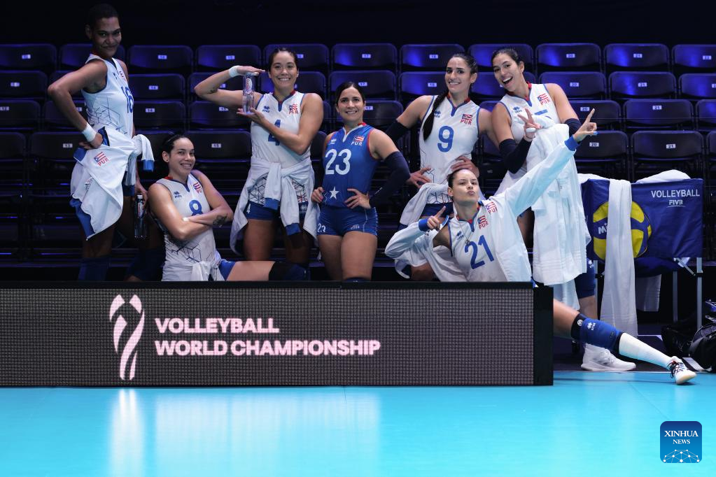 Players of Puerto Rico are seen ahead of the Phase 2 Pool E match between China and Puerto Rico at the 2022 Volleyball Women's World Championship in Rotterdam, the Netherlands, Oct. 5, 2022. (Xinhua/Meng Dingbo)