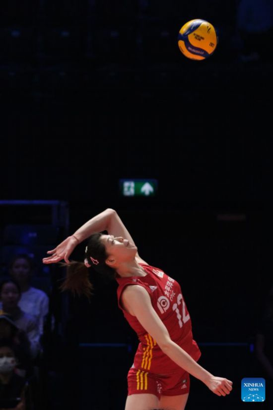 Li Yingying of China serves the ball during the Phase 2 Pool E match between China and Puerto Rico at the 2022 Volleyball Women's World Championship in Rotterdam, the Netherlands, Oct. 5, 2022. (Xinhua/Meng Dingbo)