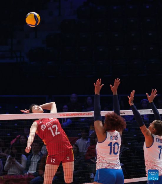 Li Yingying (L) of China spikes the ball during the Phase 2 Pool E match between China and Puerto Rico at the 2022 Volleyball Women's World Championship in Rotterdam, the Netherlands, Oct. 5, 2022. (Xinhua/Meng Dingbo)