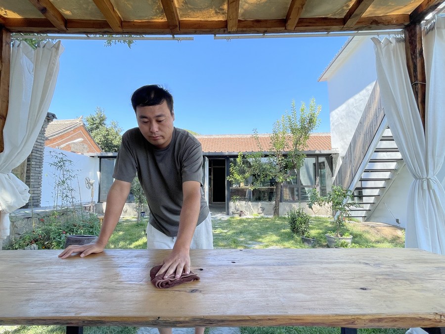 Wang Bojun cleans a table at his bed-and-breakfast in Dongtai Village of Bohai Township in Huairou District, Beijing, capital of China, Sept. 8. 2022. (Xinhua/Tian Chenxu)