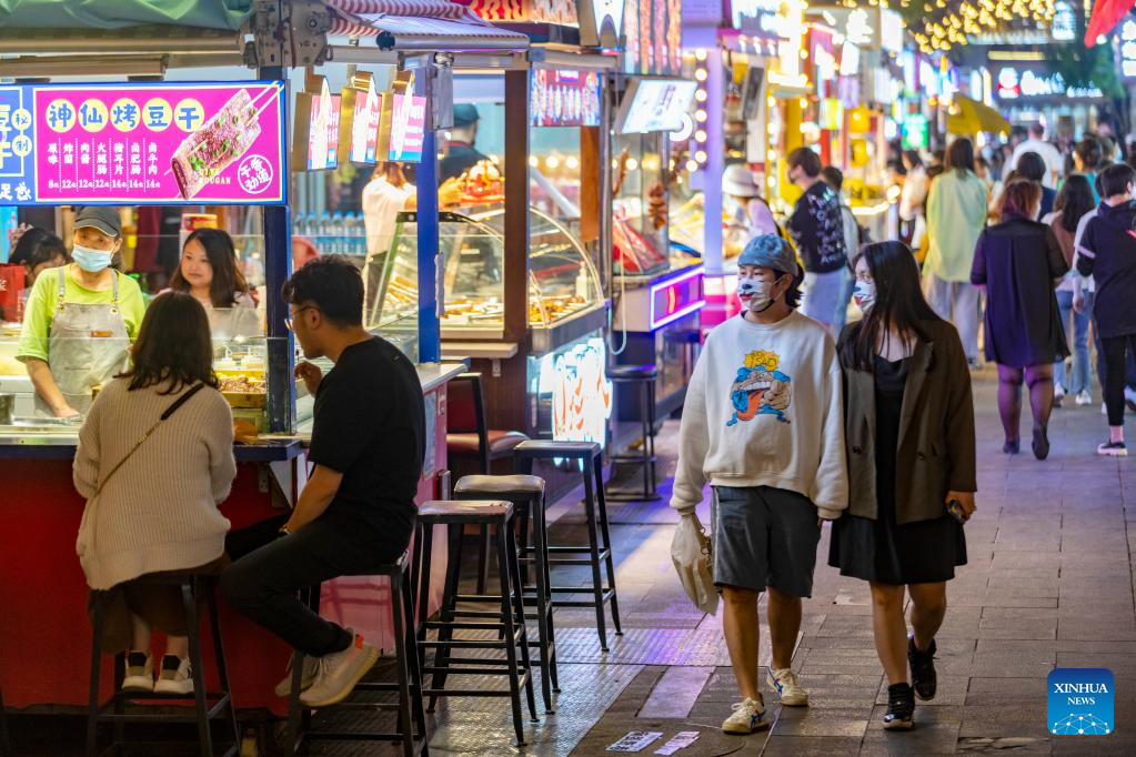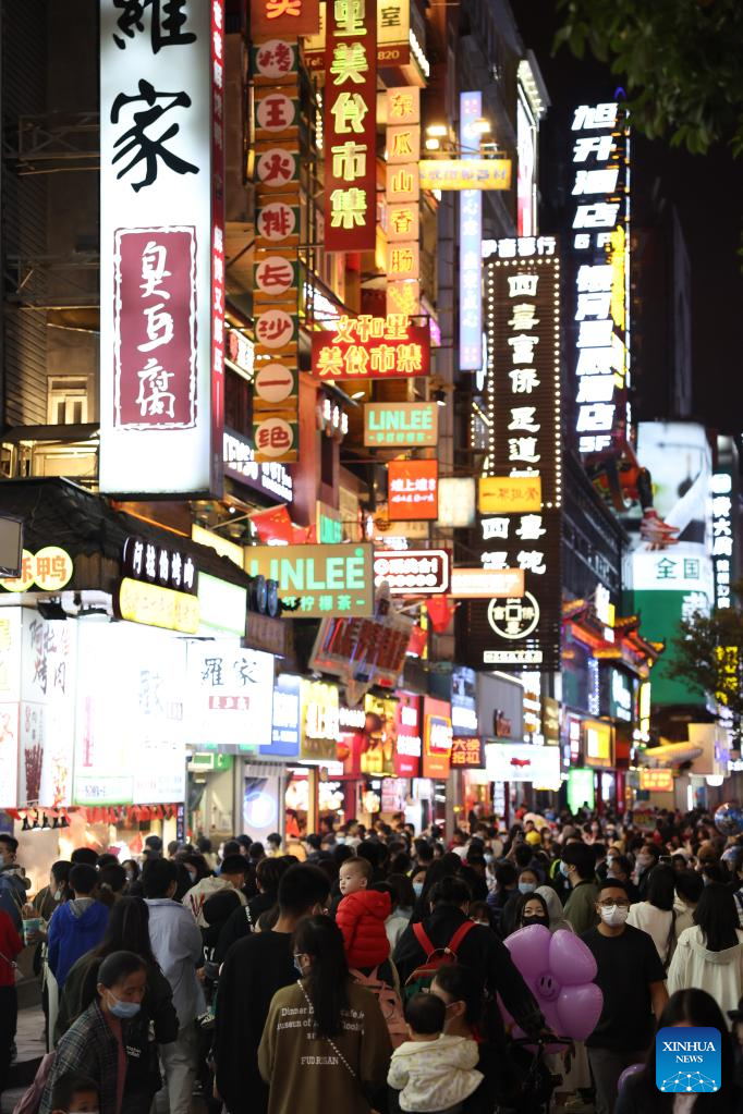 Tourists have fun on Huangxing Road in Changsha, central China's Hunan Province, Oct. 5, 2022. Various nightlife activities enrich people's leisure time during the National Day holiday. (Xinhua/Xue Yuge)