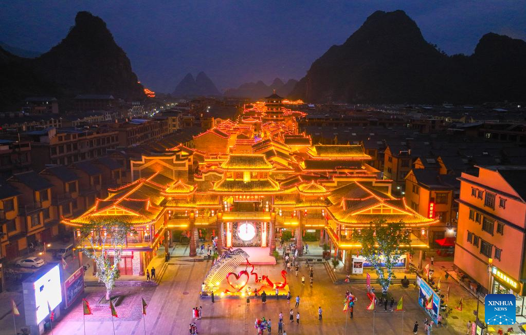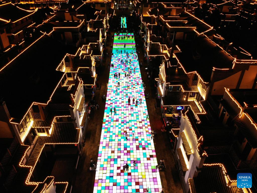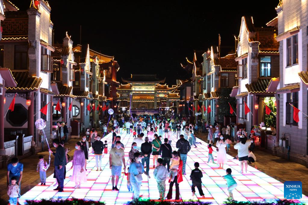 Tourists have fun at a commercial town in Mengzi, southwest China's Yunnan Province, Oct. 5, 2022. Various nightlife activities enrich people's leisure time during the National Day holiday. (Photo by Wang Yu/Xinhua)