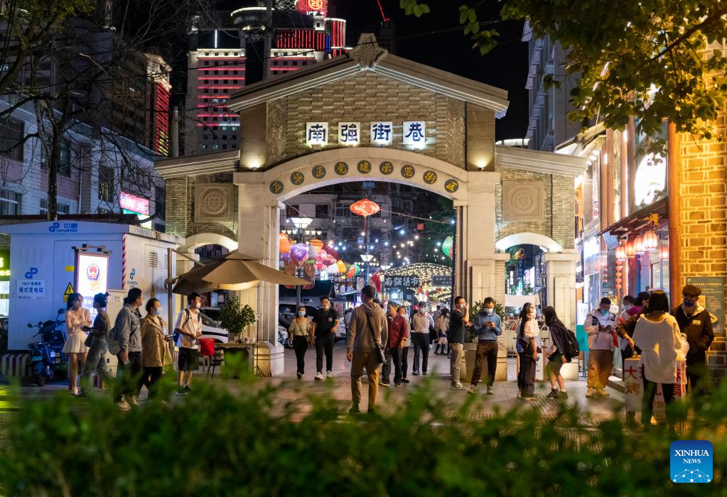 Tourists visit Nanqiang Street in Kunming, southwest China's Yunnan Province, Oct. 5, 2022. Various nightlife activities enrich people's leisure time during the National Day holiday. (Xinhua/Chen Xinbo)