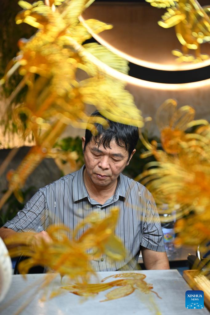 A folk artist makes a sugar figure on the Central Street in Harbin, northeast China's Heilongjiang Province, Oct. 5, 2022. Various nightlife activities enrich people's leisure time during the National Day holiday. (Xinhua/Wang Jianwei)