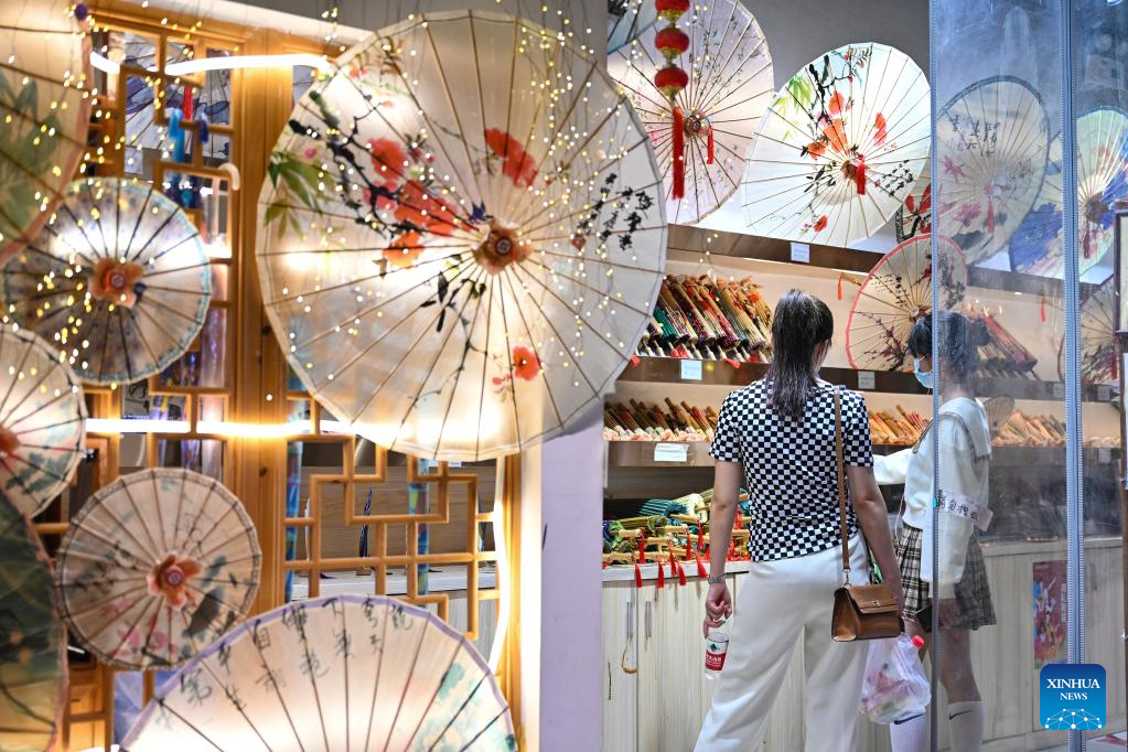 People visit Sanfangqixiang (Three Lanes and Seven Alleys), an ancient block, in Fuzhou, southeast China's Fujian Province, Oct. 6, 2022. Various nightlife activities enrich people's leisure time during the National Day holiday. (Xinhua/Zhou Yi)