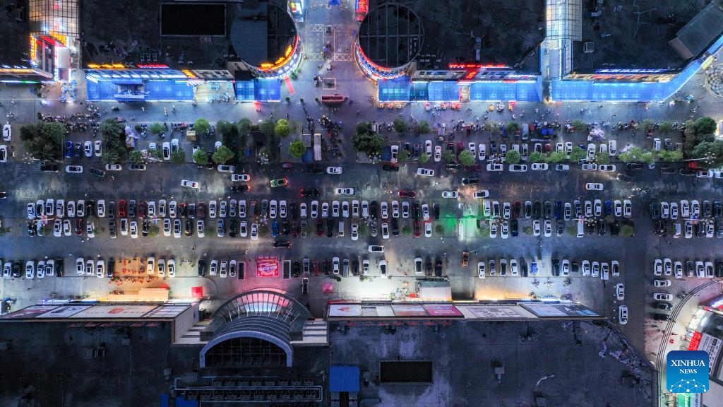 Aerial photo taken on Oct. 5, 2022 shows the view of a commercial street in Jianghua Yao Autonomous County of Yongzhou City, central China's Hunan Province. Various nightlife activities enrich people's leisure time during the National Day holiday. (Photo by Zhou Xiuyuchun/Xinhua)