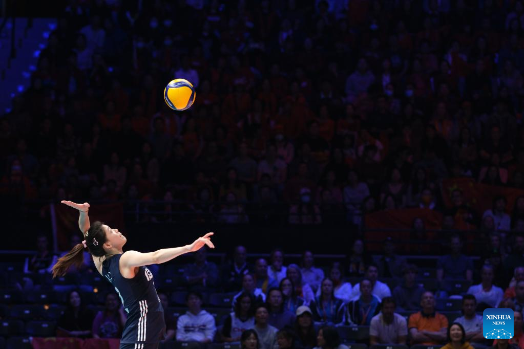Li Yingying China serves during the Phase 2 Pool E match between China and the Netherlands at the 2022 Volleyball Women's World Championship in Rotterdam, the Netherlands, Oct. 6, 2022. (Xinhua/Meng Dingbo)