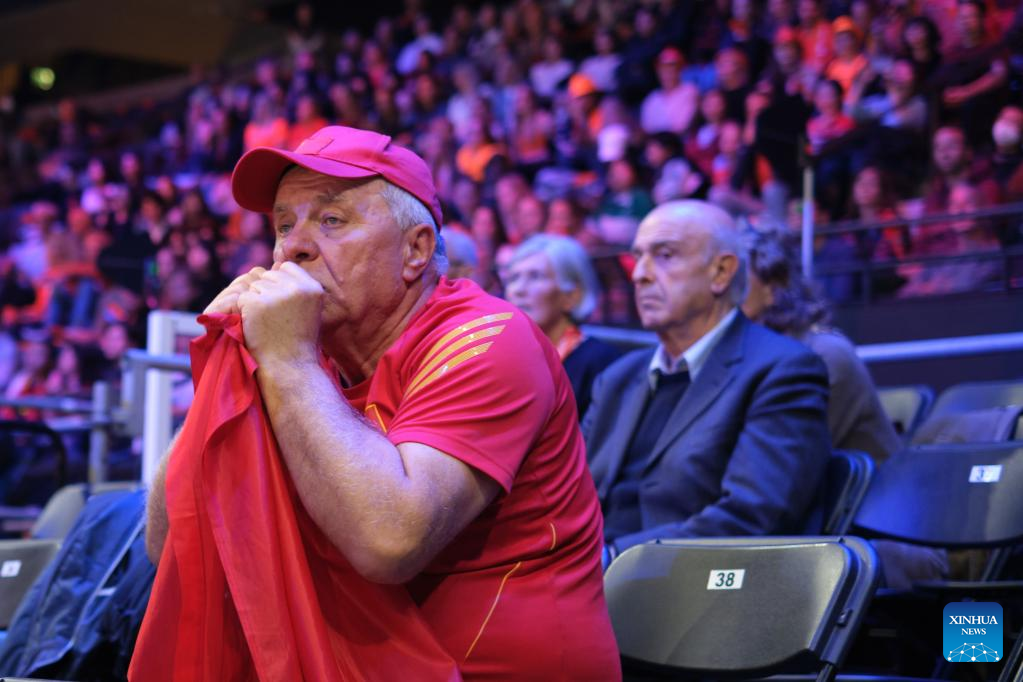 A Polish supporter for China is seen during the Phase 2 Pool E match between China and the Netherlands at the 2022 Volleyball Women's World Championship in Rotterdam, the Netherlands, Oct. 6, 2022. (Xinhua/Meng Dingbo)
