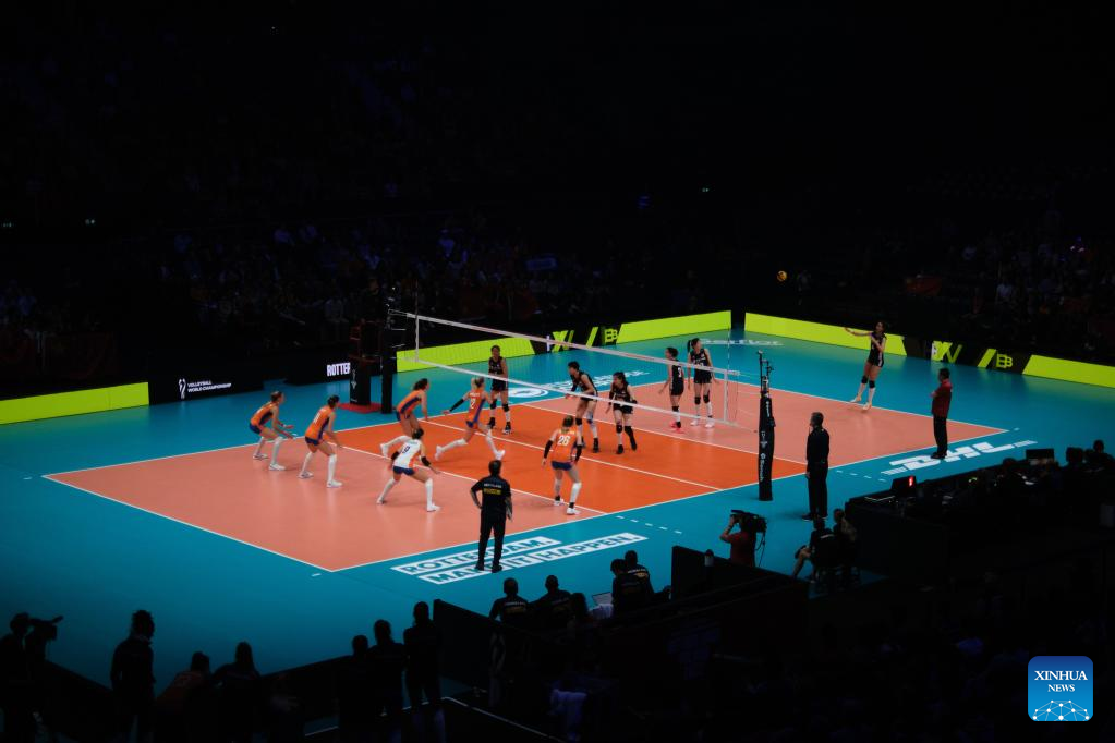 Players of both sides compete during the Phase 2 Pool E match between China and the Netherlands at the 2022 Volleyball Women's World Championship in Rotterdam, the Netherlands, Oct. 6, 2022. (Xinhua/Meng Dingbo)
