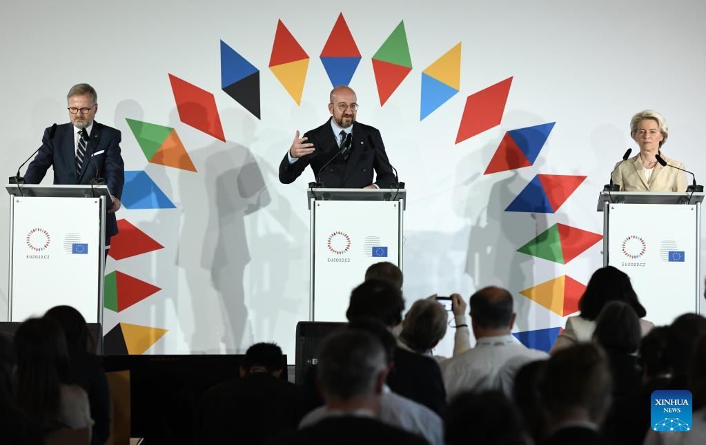 Czech Prime Minister Petr Fiala, European Council President Charles Michel and European Commission President Ursula von der Leyen (from L to R, Rear) attend a press conference after an informal summit of the European Union (EU) in Prague, the Czech Republic, on Oct. 7, 2022. European Union (EU) leaders said on Friday at an informal summit here that they are still working on coordinated energy policies for the bloc's member states to address the energy crisis plaguing families and businesses. (Xinhua/Lian Yi)