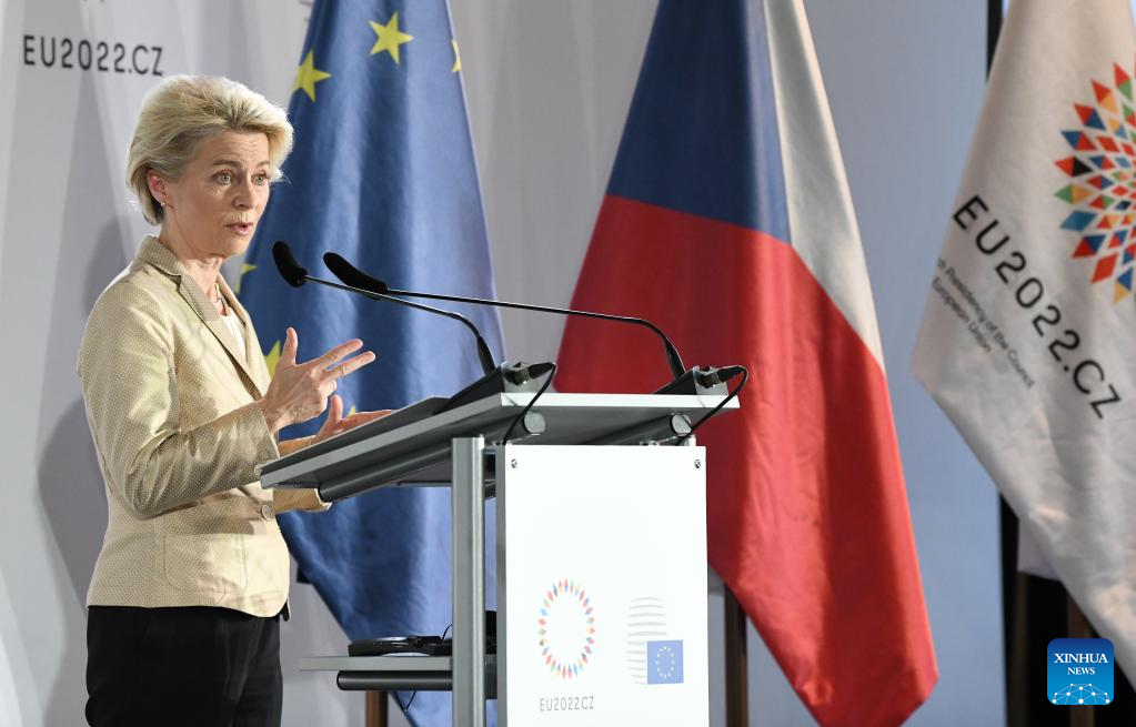 European Commission President Ursula von der Leyen attends a press conference after an informal summit of the European Union (EU) in Prague, the Czech Republic, on Oct. 7, 2022. European Union (EU) leaders said on Friday at an informal summit here that they are still working on coordinated energy policies for the bloc's member states to address the energy crisis plaguing families and businesses. (Xinhua/Lian Yi)
